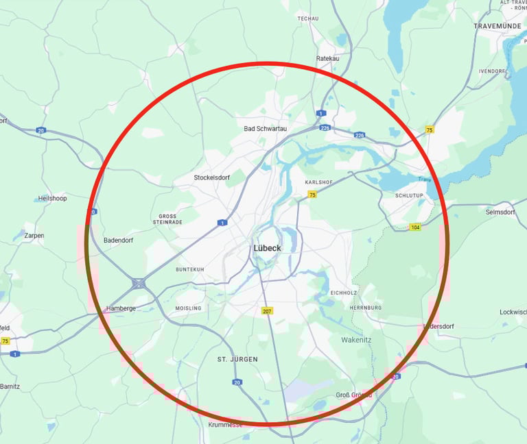 Liegt Dein Veranstaltungsort außerhalb dieses Bereichs, berechnen wir eine Fahrtkosten-Pauschale von 0,70 € pro Entfernungskilometer (ab Grenze des roten Kreises). Dieser Betrag deckt sowohl die Hin- als auch die Rückfahrt ab. Den genauen Endpreis sowie die Details zur Abrechnung stimmen wir ganz entspannt im Rahmen Deiner individuellen Terminvereinbarung ab.